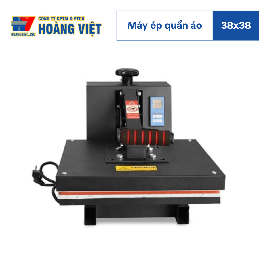 Máy ép áo khổ 38x38 chuyên ép chuyển nhiệt lên áo thun, vải, đồng phục với hình in sắc nét, bền màu. Gia nhiệt nhanh, tản nhiệt đều nhờ 6 thanh nhiệt, dễ chỉnh nhiệt độ và thời gian bằng đồng hồ điện tử.