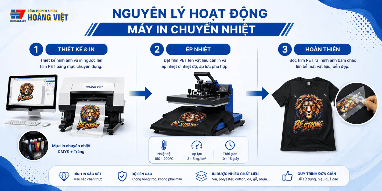 Máy in chuyển nhiệt là công nghệ in hiện đại, đáp ứng tốt nhu cầu in ấn đa dạng với chất lượng cao và độ bền ổn định. Nhờ nguyên lý hoạt động đơn giản nhưng hiệu quả, công nghệ này đang ngày càng được ứng dụng rộng rãi, đặc biệt trong lĩnh vực in áo chuyển nhiệt.