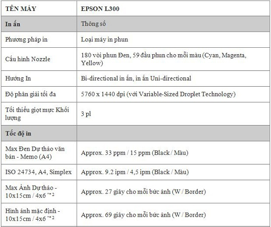 3. Thông số kỹ thuật máy in phun màu Epson L300.