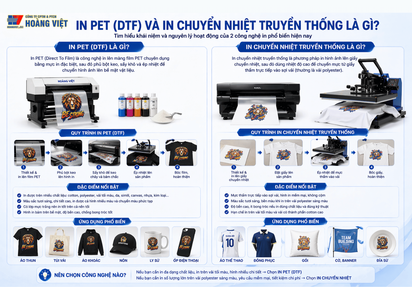 In PET và in chuyển nhiệt truyền thống đều là những công nghệ quan trọng trong ngành in áo hiện nay, mỗi loại phù hợp với một nhóm nhu cầu khác nhau. Việc hiểu rõ nguyên lý, ưu điểm và hạn chế của từng công nghệ sẽ giúp bạn đưa ra quyết định đầu tư chính xác hơn.